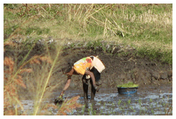 Respecting the children, mothers, old people, and rice plantations are recommended by the tradition. Rice, the basic food of Malagasy people, is cultivated in the draughtboard-fields or as in Fianarantsoa region sometimes in terrace cultivation on the hillsides. At present, large farming is being extended to facilitate mechanization. 'Do not sing of your own merits as the rice which boils in the pot... Do like rice ears: to be held right is well, knowing how to bow is better...' and anything else as well. Here, in Madagasikara, rice fills the proverbs. The Malagasy will not ask you for meal, but to share his rice. Manasa hihinam-bary e!